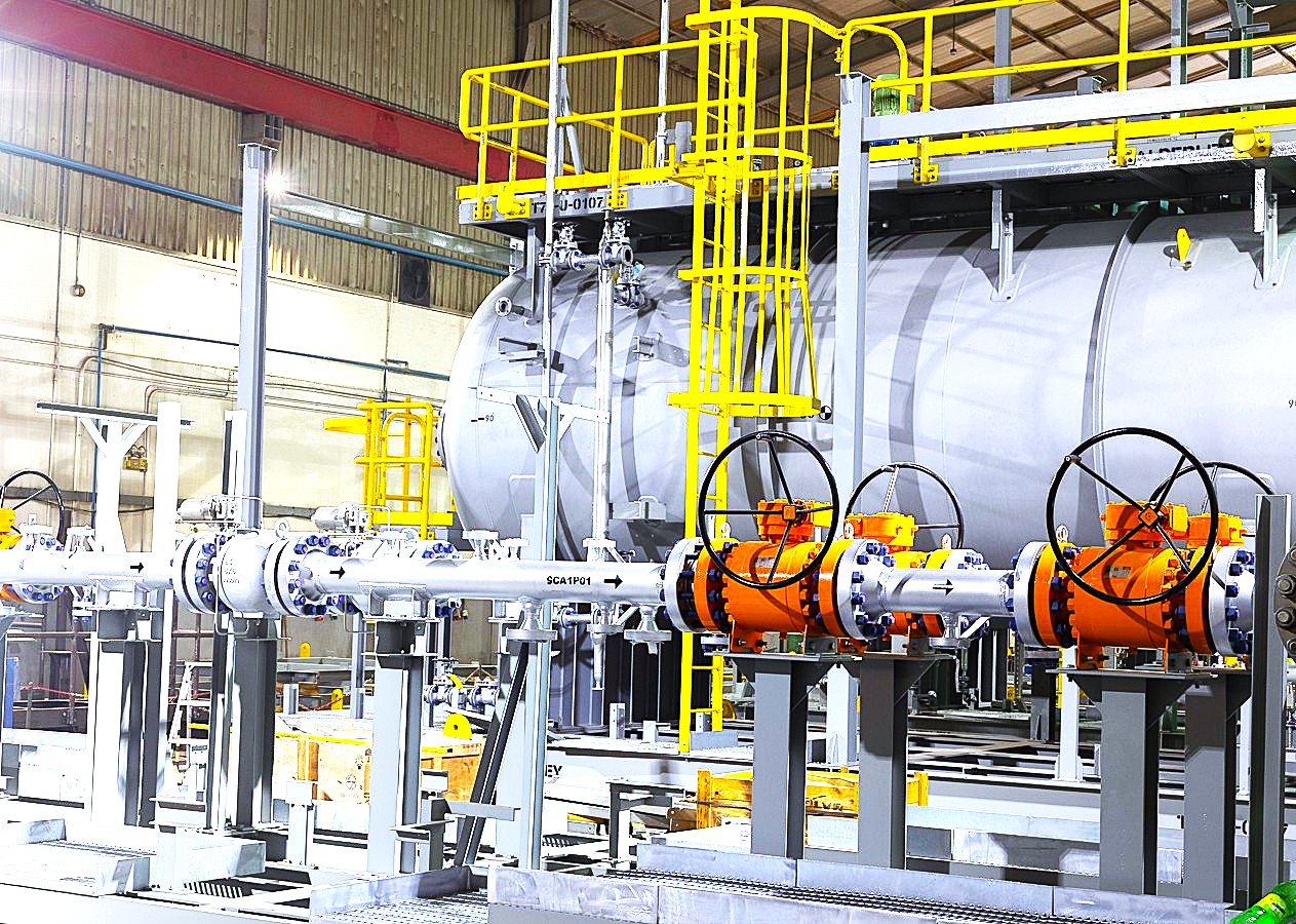 The system operates by rapidly detecting pressure surges and relieving excess pressure through a dedicated surge relief valve to a safe disposal or recovery system. Typical configurations include surge relief valves (pilot-operated or direct-acting), high-accuracy pressure transmitters, fast-acting solenoid valves, accumulators, and a local control panel, all mounted on a single skid with interconnecting piping and instrumentation. Designed and manufactured in compliance with Saudi Aramco standards (SAES, SAMSS) and international codes such as ASME, API, and ISO, the SRS ensures precise response time and stable operation under dynamic surge conditions. The system’s modular design, redundant control logic, and maintenance-friendly layout ensure high reliability, safety, and long-term protection of critical pipeline infrastructure in oil & gas, petrochemical, and utility applications.
